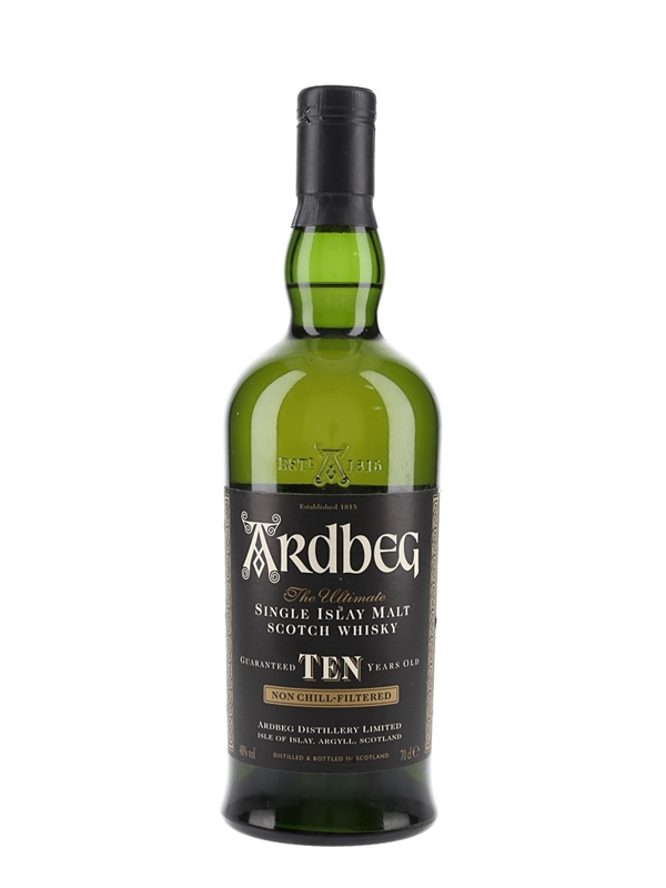 A bottle of Ardbeg 10 Year Old The Ultimate Islay Single Islay Malt Scotch Whisky. The bottling code indicates this was bottled in 2000.