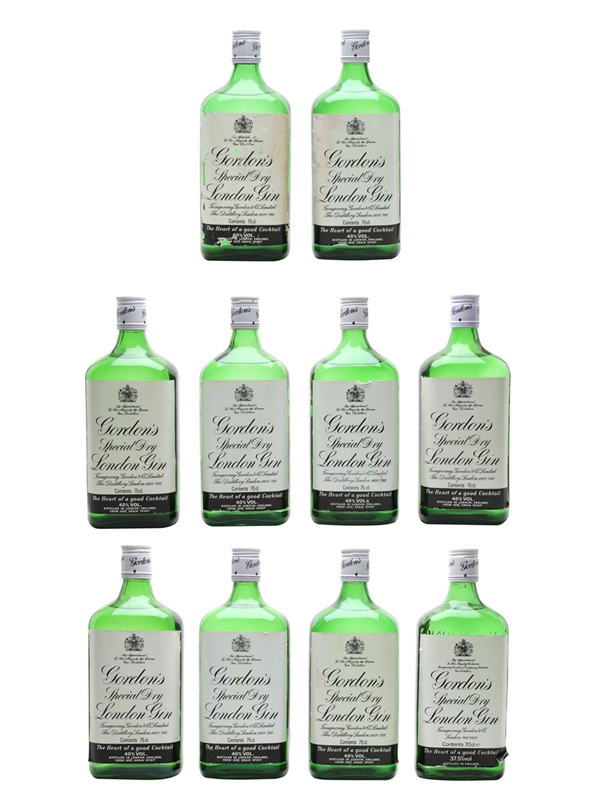 This lot contains 10 bottles of Gordon's Special Dry London Gin, distilled and bottled by Tanqueray, Gordon & Co. Limited, The Distillery, London. We estimate these were bottled in the 1980s.