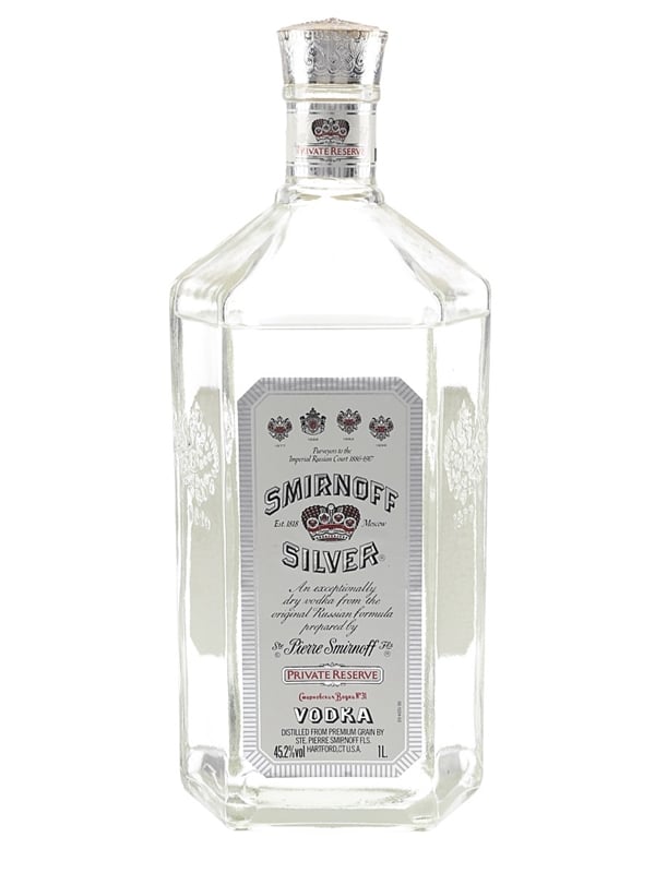A litre bottle of Smirnoff Silver Private Reserve Vodka produced in the United States.