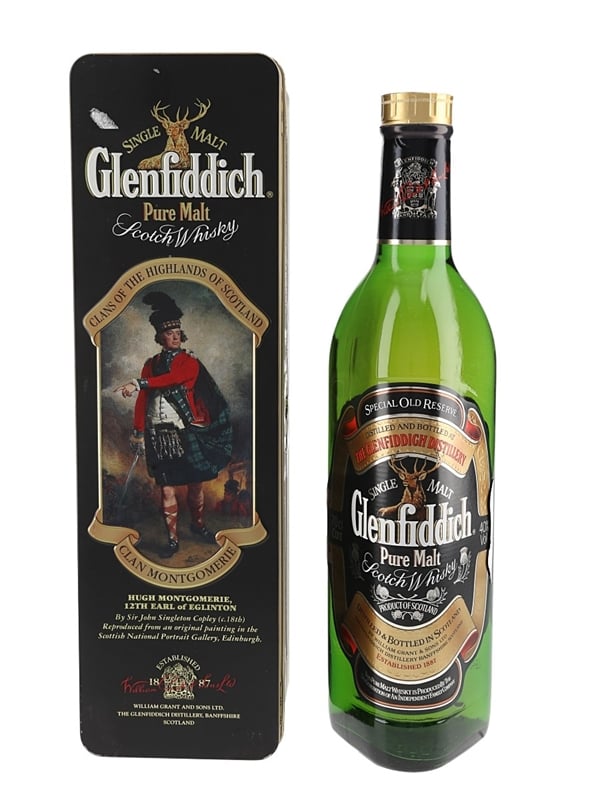 A bottle of Glenfiddich Special Old Reserve Single Malt Scotch Whisky, distilled, matured and bottled by William Grant & Sons Ltd. and presented in a Clans of the Highlands of Scotland presentation tin.
