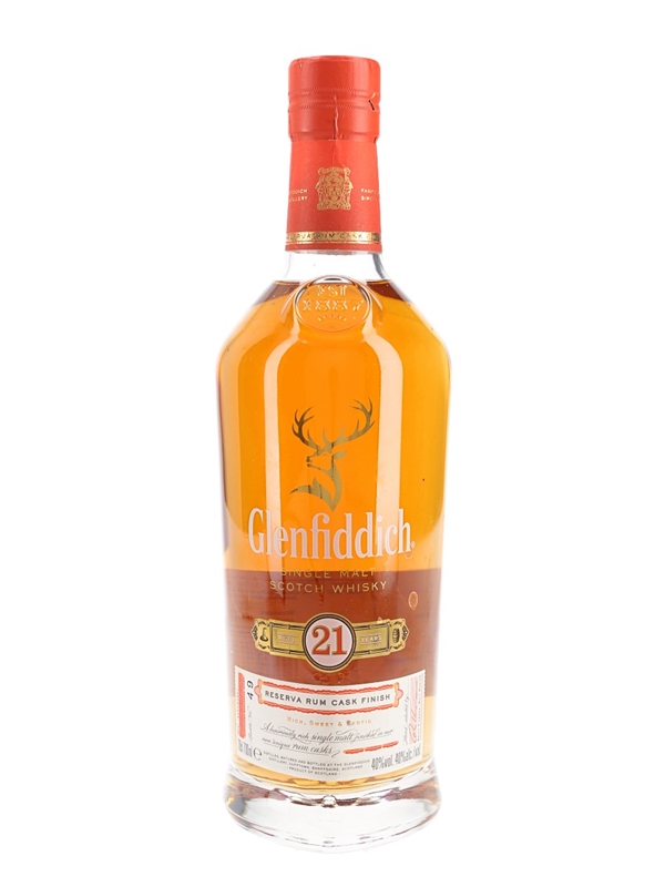 A bottle of Glenfiddich 21 Year Old Reserva Rum Cask Finish Single Malt Scotch Whisky in a presentation box. This was matured for four months in rum casks before bottling.
