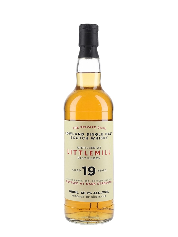 A bottle of Littlemill 19 Year Old Single Malt Scotch Whisky. This was distilled in April 1992 and bottled at a cask strength of 60.2% ABV in July 2011 as part of the Private Cask series.