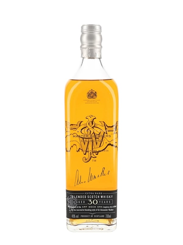 A limited edition bottle of Johnnie Walker 30 Year Old Extra Rare Blended Scotch Whisky. This release, inspired by the Art Deco Era, was bottled in honour of Sir Alexander Walker as part of the Masters Blenders Collection.