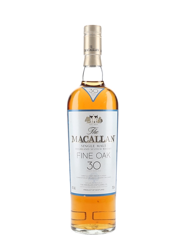 A bottle of The Macallan 30 Year Old Fine Oak Single Highland Malt Scotch Whisky, matured in a combination of bourbon and sherry casks.