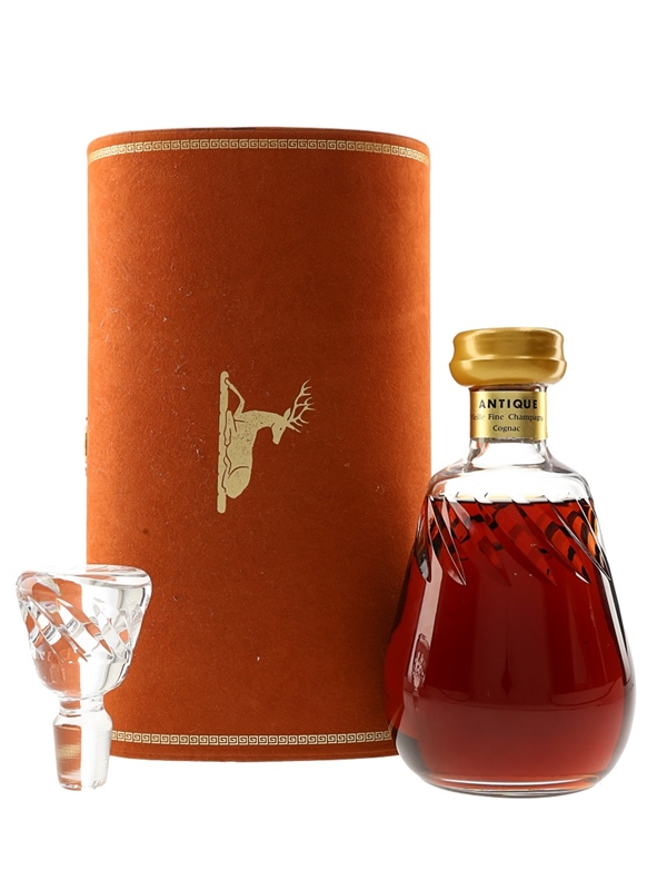 A bottle of Hine Antique Très Vieille Fine Champagne Cognac, presented in a crystal decanter with stopper in a presentation case. We estimate this was bottled in the 1970s.