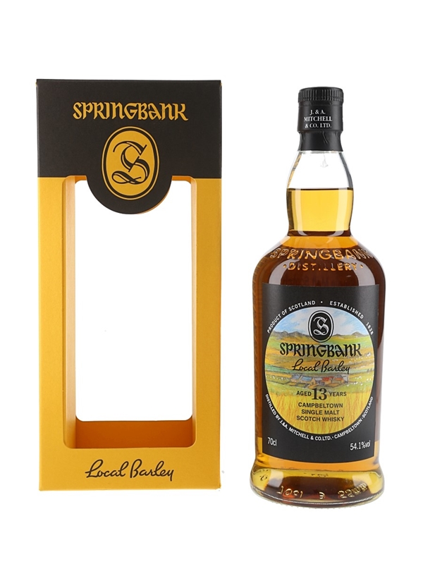 A bottle of Springbank 13 Year Old Local Barley Campbeltown Single Malt Scotch Whisky. This was distilled in June 2010 from Belgravia barley grown on Glencraigs Farm, matured for 13 years and bottled in December 2023.