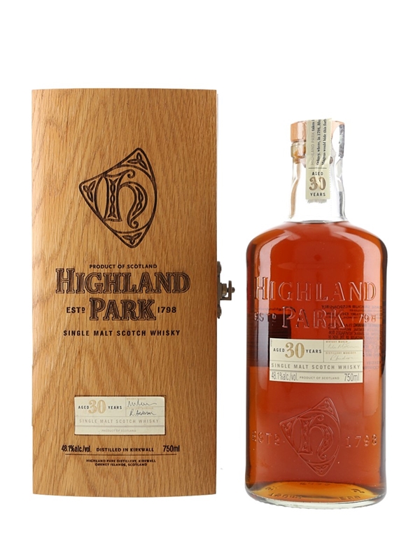 A bottle of Highland Park 30 Year Old Single Malt Scotch Whisky presented in a wooden box. This was matured in Spanish sherry casks and bottled at 48.1% ABV.