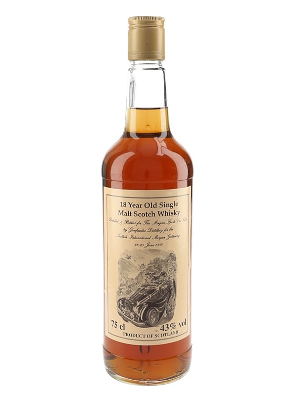 A bottle of Glenfarclas 18 Year Old Single Malt Scotch Whisky. This was distilled and bottled for Morgan Sports Car Club by Glenfarclas Distillery for the Scottish International Morgan Gathering 23-25 June 1989.