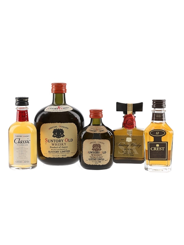 This lot contains five miniature bottles from Suntory including Crest 12 Year Old, Suntory Royal Whisky, Suntory Classic ,18cl Suntory Old Whisky & 5cl Suntory Old Whisky, matured, blended and bottled by Suntory Limited.