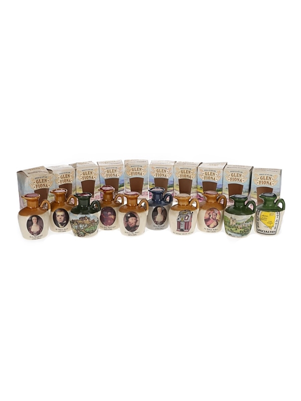 This lot contains ten miniature bottles of Glen Fiona Blended Scotch Whisky presented in Lindisfarne ceramic decanters.