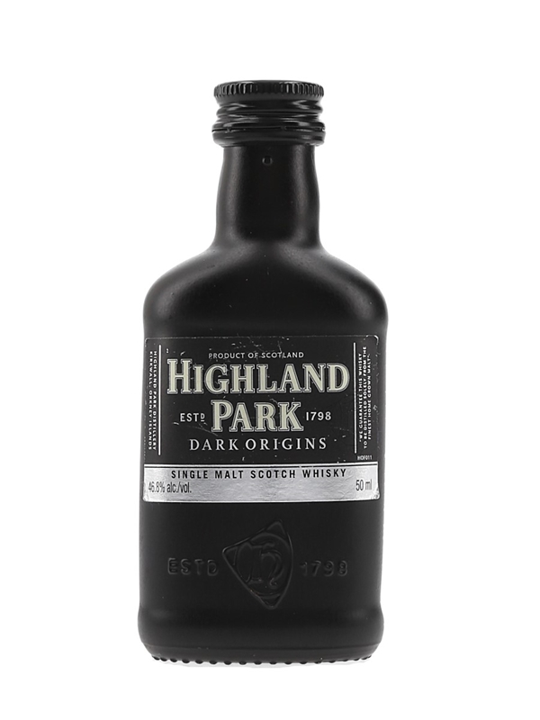 A miniature bottle of Highland Park Dark Origins Single Malt Scotch Whisky.