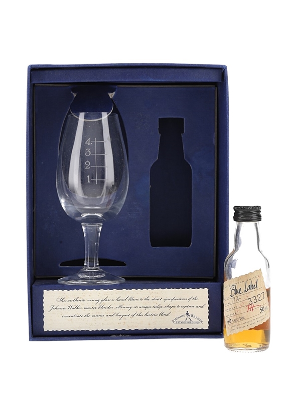 The Secret of Johnnie Walker Blue Label includes a sample bottle of Blue Label (sample number 3327), a tulip nosing glass.