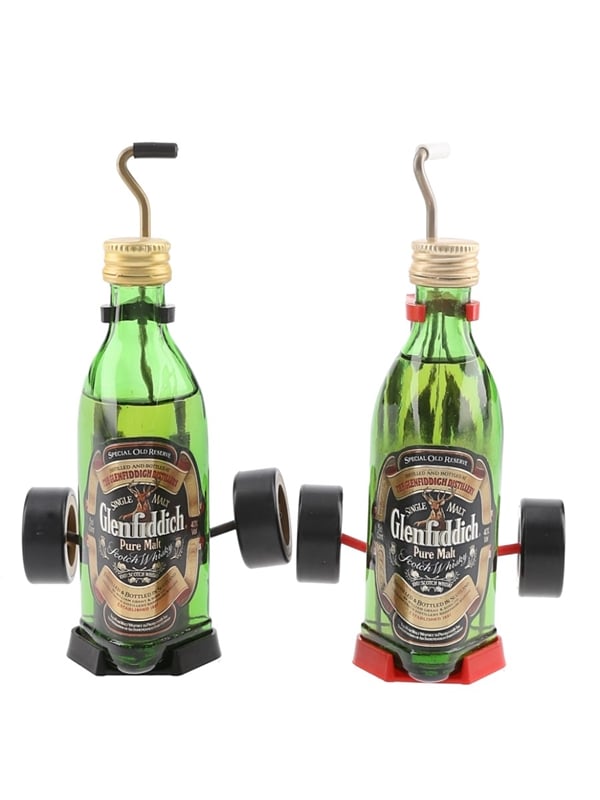 This lot contains two miniature bottles of Glenfiddich Pure Malt Scotch whisky, one is presented in miniature golf trolley. We estimate these were bottled in the 1980s.