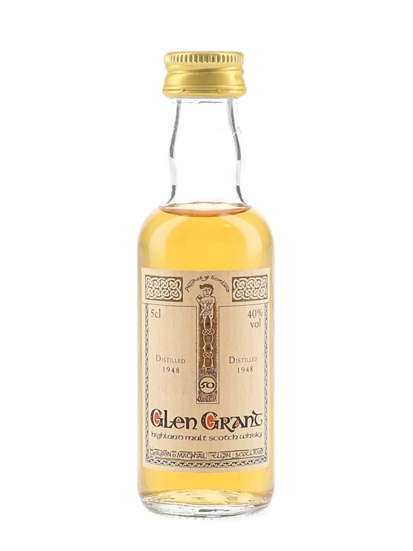 A miniature bottle of Glen Grant 50 Year Old Highland Malt Scotch Whisky. This was distilled in 1948 and bottled by Gordon & MacPhail. The label is adapted from the ancient Book of Kells. The bottling code indicates this was bottled in 1998.