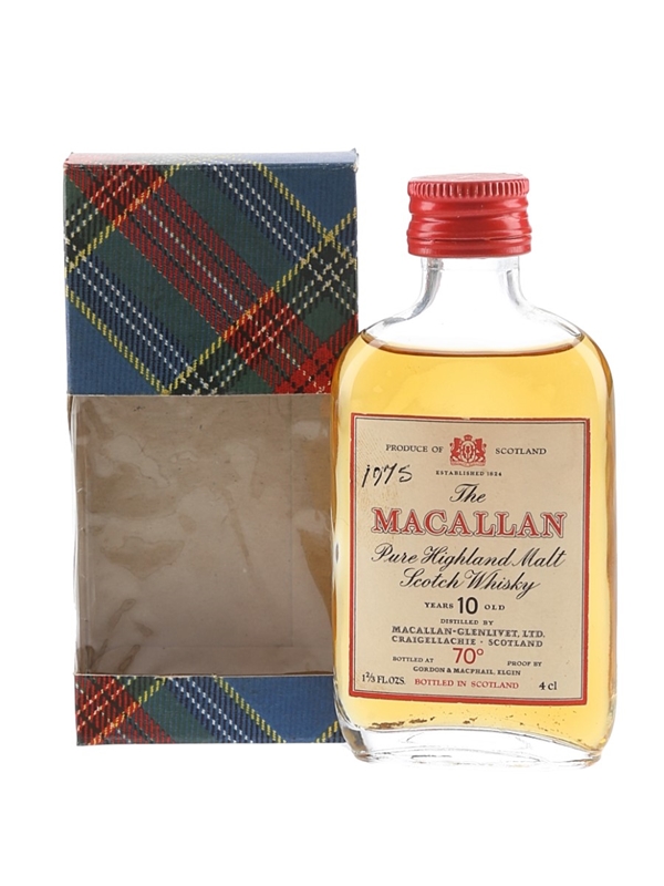 A miniature bottle of The Macallan 10 Year Old Pure Highland Malt Scotch Whisky. This was bottled by Gordon & MacPhail, we estimate in the 1970s.