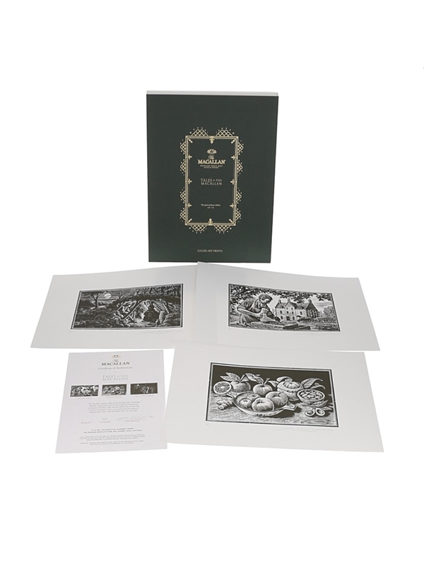 This lot contains a set of three 21 x 29.7cm Giclée Macallan Tales of The Macallan Volume I prints. These are digitally remastered prints of wood engraved illustrations by artist Andrew Davidson.