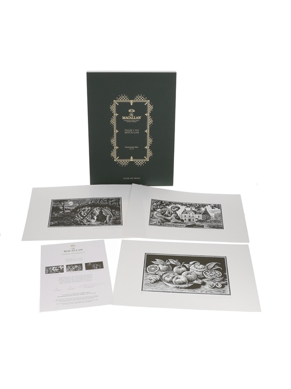 This lot contains a set of three 21 x 29.7cm Giclée Macallan Tales of The Macallan Volume I prints. These are digitally remastered prints of wood engraved illustrations by artist Andrew Davidson.