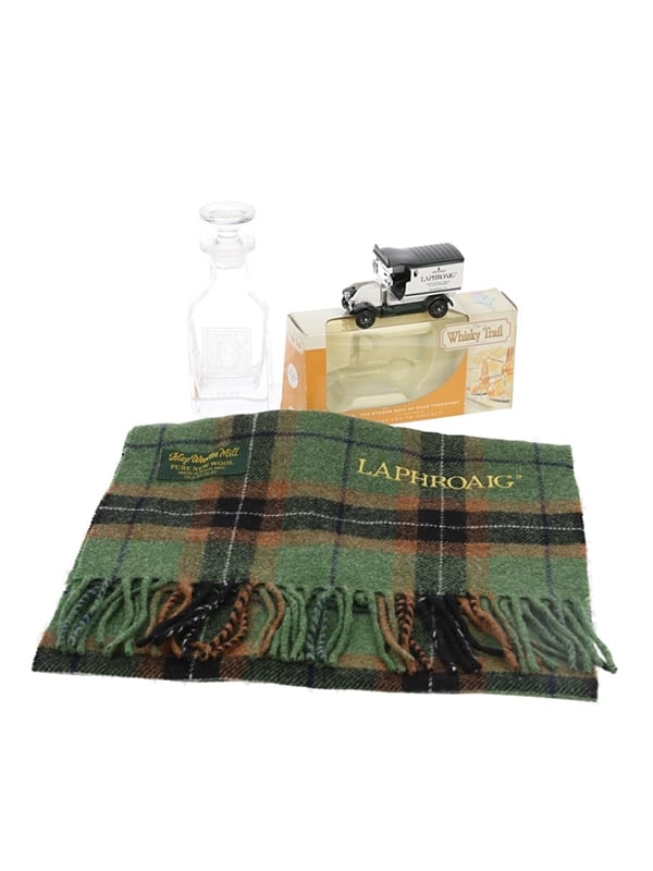 This lot contains a Miniature Highland Park Decanter, a Laphroaig Whisky Trail toy car and a Islay Woollen Mill Laphroaig Scarf