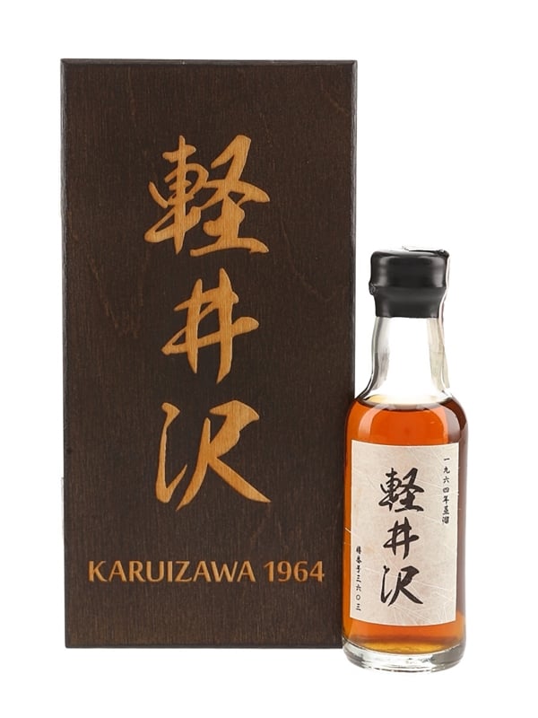 A miniature bottle of Karuizawa Single Cask Japanese Malt Whisky. This was distilled on 1 September 1964, aged for 48 years in a single sherry cask and bottled at natural cask strength on 24 December 2012 at 57.7% ABV for Wealth Solutions.