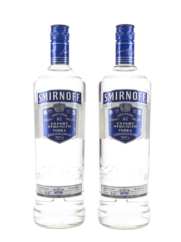 2 x litre bottle of Smirnoff No. 57 Export Strength vodka, produced in the UK. This was triple distilled from premium grain, ten times filtered and bottled 50% ABV.