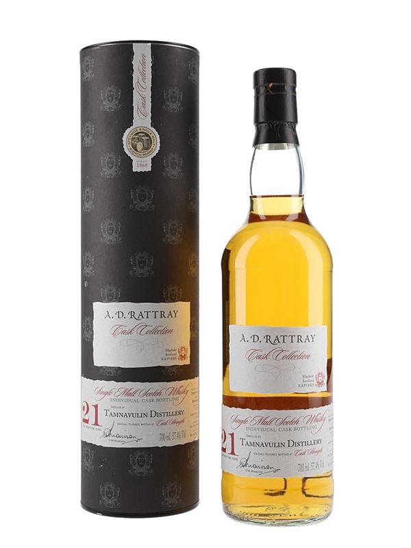 A bottle of Tambavulin 21 Year Old Single Malt Scotch Whisky A D Rattray's Cask Collection. This was distilled on 9 May 1989, matured in a single bourbon cask, and bottled at 57.4% ABV on 18 February 2011 by A D Rattray.