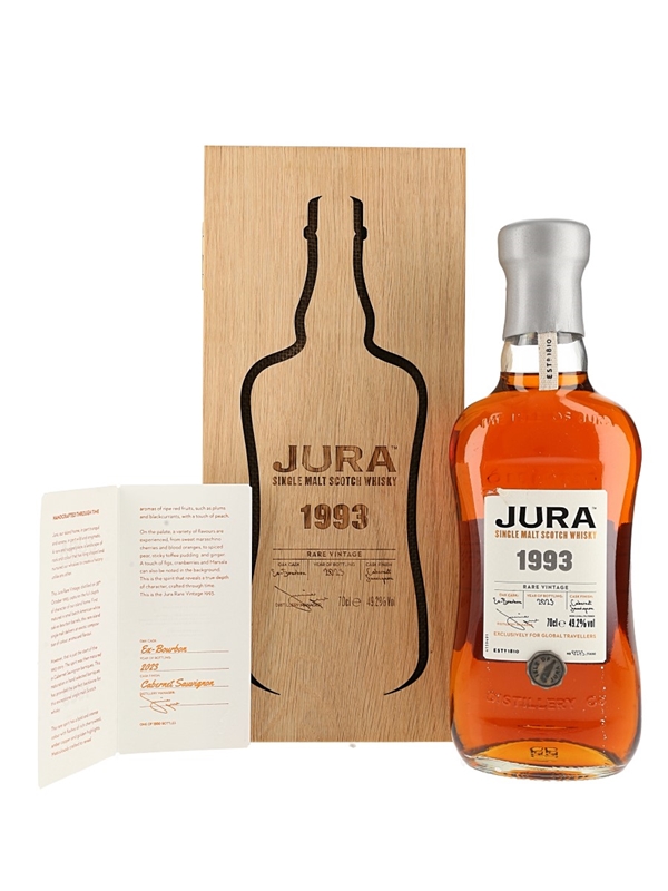 A bottle of Isle of Jura Old Single Malt Scotch Whisky Rare Vintage. This was distilled in 1993, matured in ex-bourbon casks, finished in Cabernet Sauvignon red wine barrique and bottled exclusively for global travelers in 2023