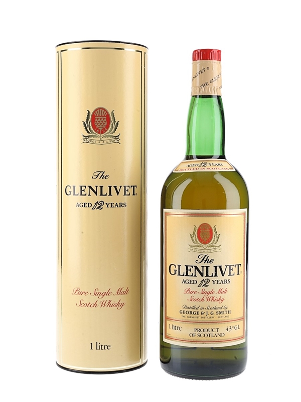 A litre bottle of The Glenlivet 12 Year Old Unblended All Scotch Whisky. We estimate this was bottled in the 1980s.