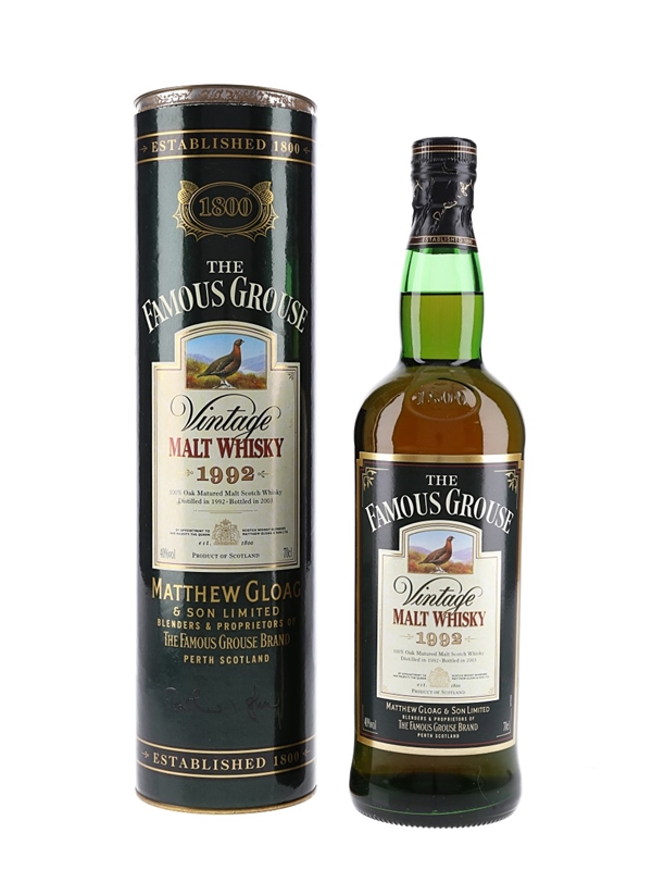 A bottle of The Famous Grouse Vintage Malt Whisky produced by Matthew Gloag & Sons Limited. This was distilled in 1992 and bottled in 2003. This whisky include malts from Highland Park and The Macallan.