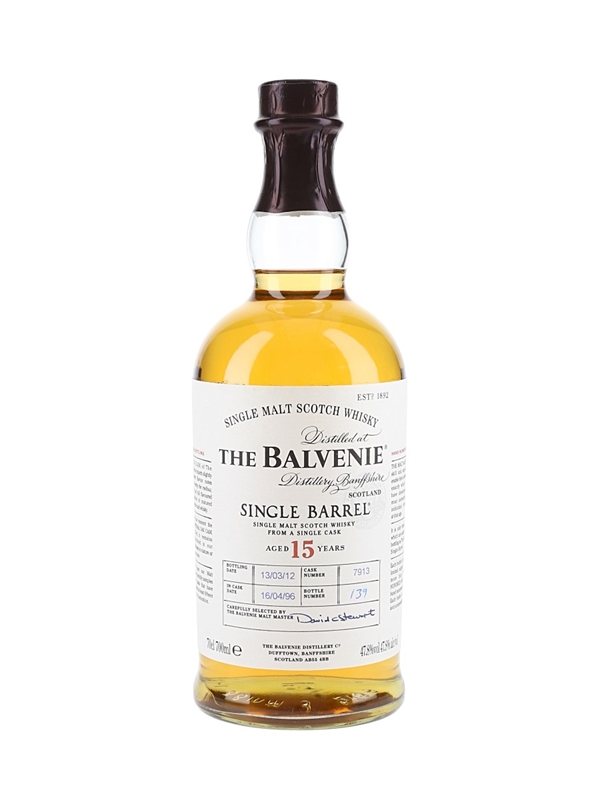A bottle of The Balvenie 15 Year Old Single Barrel Malt Scotch Whisky. This was distilled on 16 April 1996, matured in a single cask and bottled on 13 March 2012.