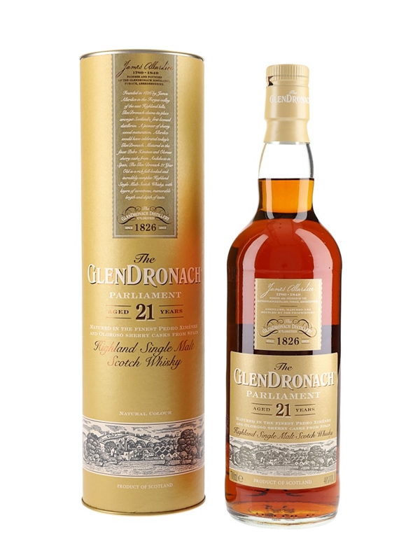 A bottle of The Glendronach 21 Year Old Highland Single Malt Scotch Whisky, named for the Parliament of rooks that live near the distillery. This was matured in a combination of Oloroso and Pedro Ximénez sherry casks, and bottled at 48% ABV.