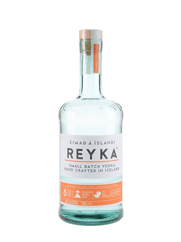 A bottle of Reyka, a small batch vodka hand crafted in Iceland, traditionally distilled and filtered through ancient Arctic lava rocks.