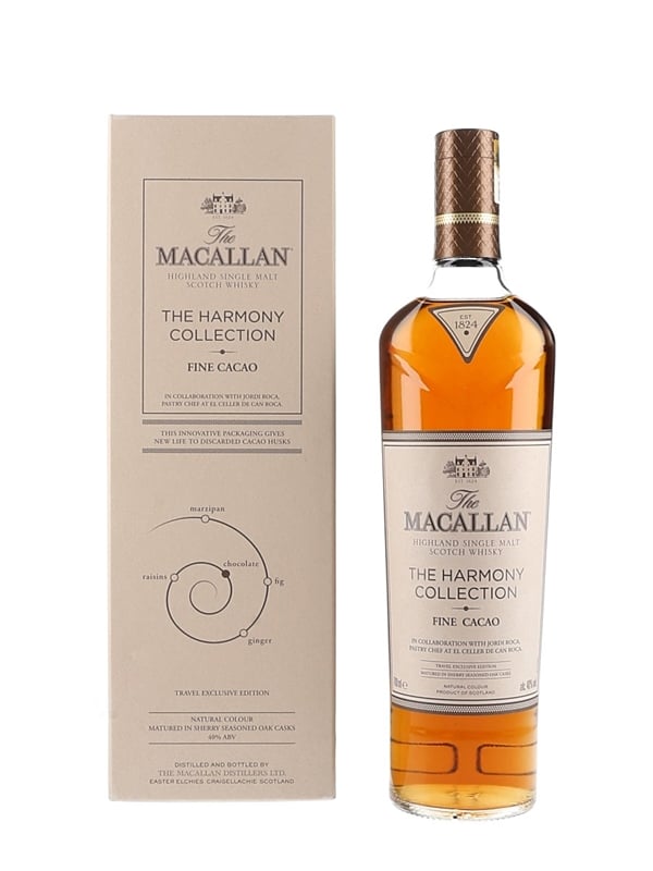 A bottle of The Macallan Fine Cacao Highland Single Malt Scotch Whisky from The Harmony Collection. This is inspired by the chocolate creations of Spanish chef Jordi Roca, pastry chef at El Celler de Can Roca. The restaurant was twice voted best restaurant in the world.