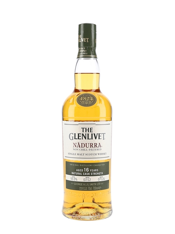 A bottle of The Glenlivet 16 Year Old Nadurra Natural Cask Strength Single Malt Scotch Whisky produced by George & J. G. Smith Ltd. and bottled at a natural cask strength of 55.5% ABV in July 2012. This bottle is from Batch Number 0712U.