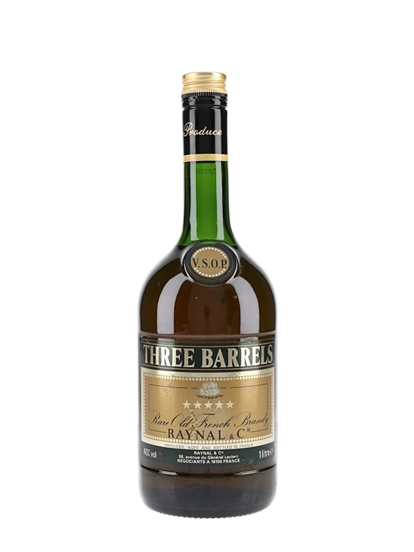 An old presentation litre bottle of Three Barrels VSOP 5 Star Rare Old French Brandy, bottled for the duty free market.