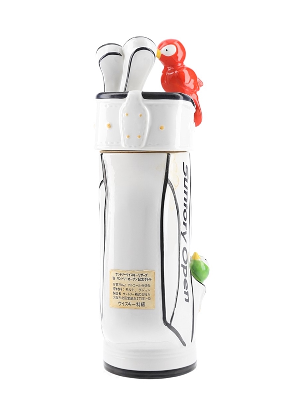 A 76cl bottle of Suntory Open Golf Tournament 1988 Royal 15 Year Old blended whisky, presented in a ceramic golf bag shaped decanter with a bird atop it.