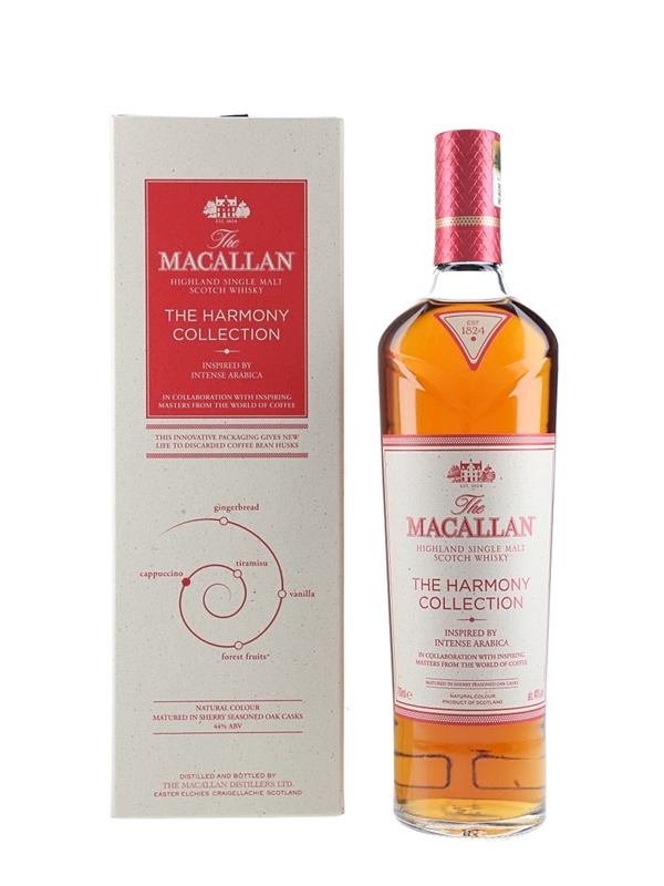 A bottle of The Macallan Intense Arabica Highland Single Malt Scotch Whisky from The Harmony Collection. This is inspired by the Ethiopian Arabica bean, in collaboration with inspiring masters from around the world of coffee.