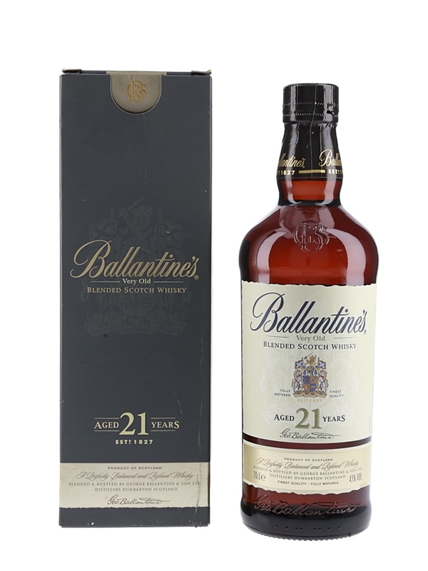 A bottle of Ballantine's 21 Year Old Very Old Scotch Whisky, produced and bottled by George Ballantine & Son Ltd.