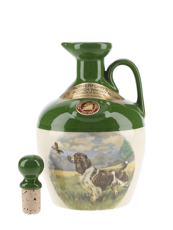 A bottle of Rutherford's blended Scotch whisky in a ceramic decanter featuring a hunting dog produced by Montrose Pottery, we estimate in the 1980s.
