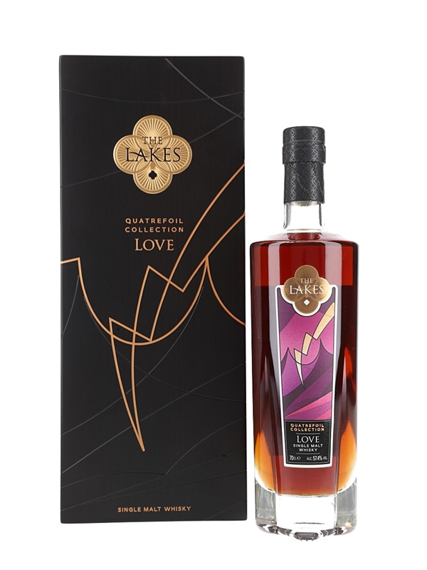A limited edition bottle of The Lakes Quatrefoil Collection Love English Single Malt Whisky, matured in American oak casks seasoned with Oloroso and PX sherry and bottled at 57.4% ABV. This is one of 1000 bottles produced.