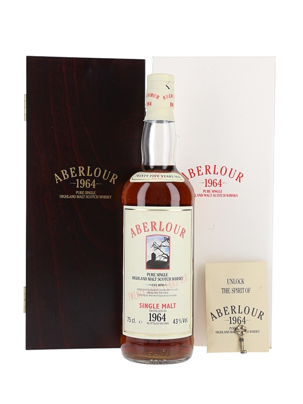 A bottle of Aberlour 25 Year Old Pure Single Malt Scotch Whisky, presented in a lockable wooden box with a key. This was distilled in 1964 and bottled in 1989.