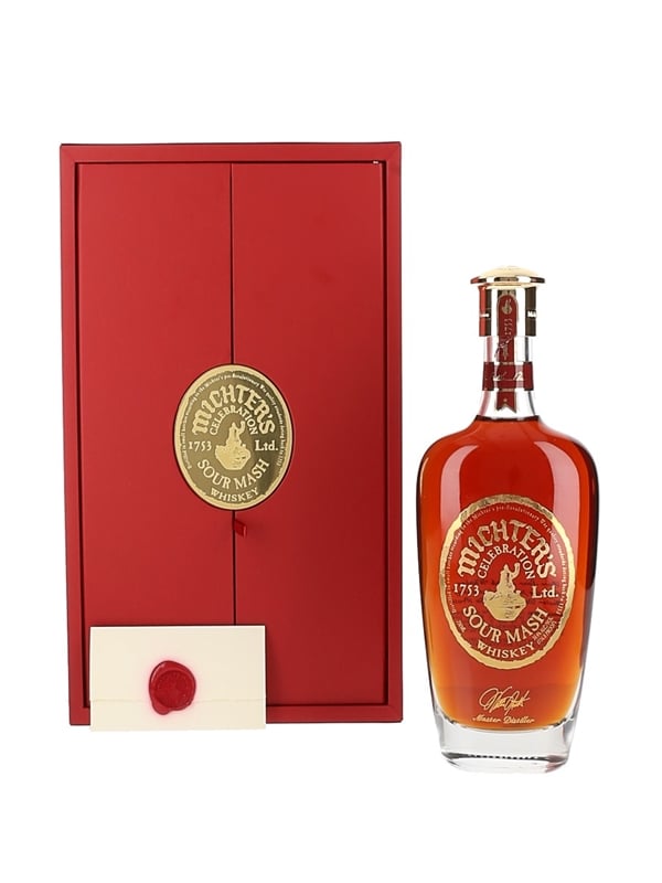 A bottle of Michter's Celebration Sour Mash 2016 Single Barrel Bourbon Whisky. This is a blend of straight bourbon and straight rye whiskies of undisclosed origin, aged between 10 and 30 years.