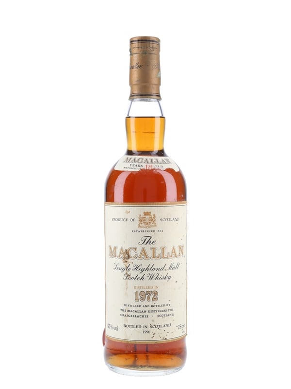 A bottle of The Macallan 18 Year Old Single Highland Malt Scotch Whisky. This was distilled in 1972, matured in sherry casks and bottled in 1990.