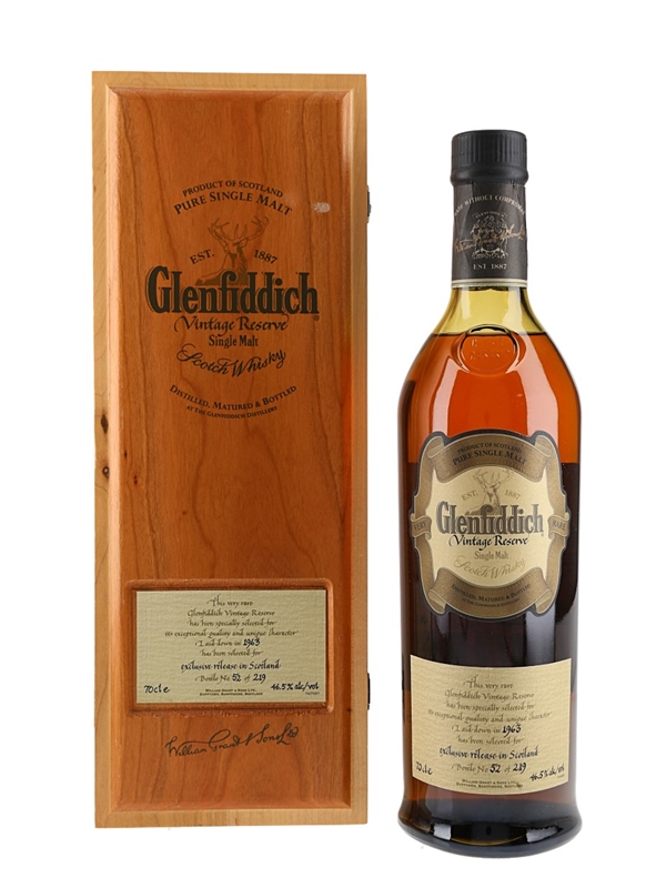 A bottle of Glenfiddich Vintage Reserve Single Malt Scotch Whisky. This was distilled in 1963 and bottled at 46.5 ABV on 15 October 2001.