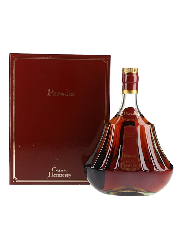 A bottle of Hennessy Paradis Cognac in a presentation box. This expression is created from some of Hennessy's oldest stocks, known as 'Paradis', stored in a separate cellar called 'Le Chai du Fondateur'. We estimate this was bottled in the late 1970s to 1980s.