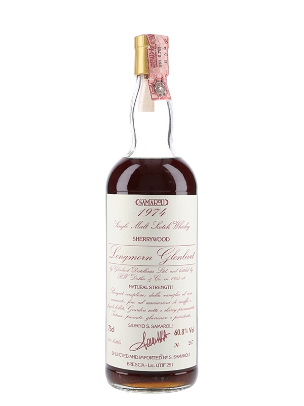 A bottle of Longmorn Glenlivet Single Malt Scotch Whisky. This was distilled in 1974, matured in sherry wood and bottled at natural strength of 60.8% ABV in 1985 for Italian importer Samaroli.