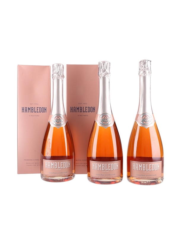 This lot contains three bottles of Hambledon Vineyard Première Cuvée Rosé sparkling wine, produced in Hampshire using the saignée method for the Pinot Meunier component of the blend.