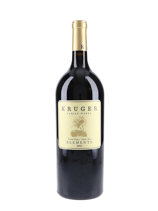 A magnum bottle of 2021 Kruger Elements produced by Kruger Family Wines in South Africa's Coastal Region, a Bordeaux blend of 58% Cabernet Sauvignon, 18% Merlot, 15% Petit Verdot and 9% Malbec.