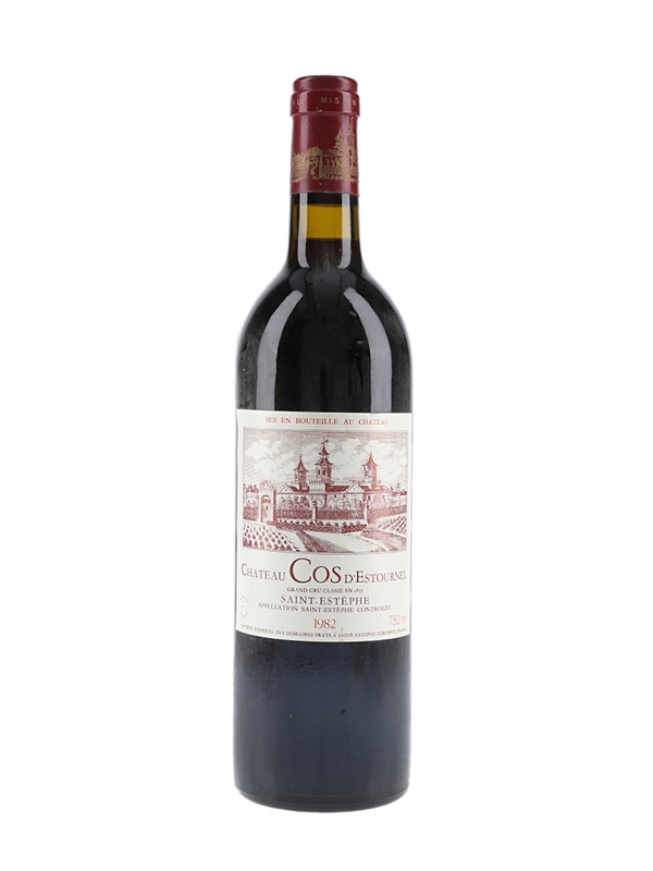 A bottle of 1982 Château Cos d'Estournel, a 'super second' growth in the 1855 Classification, from the Saint-Estèphe appellation in Bordeaux.