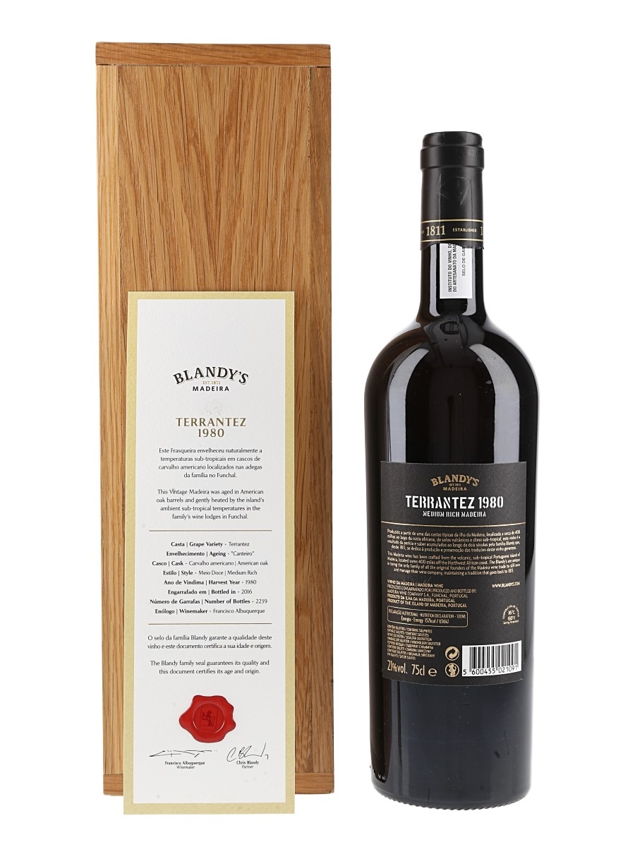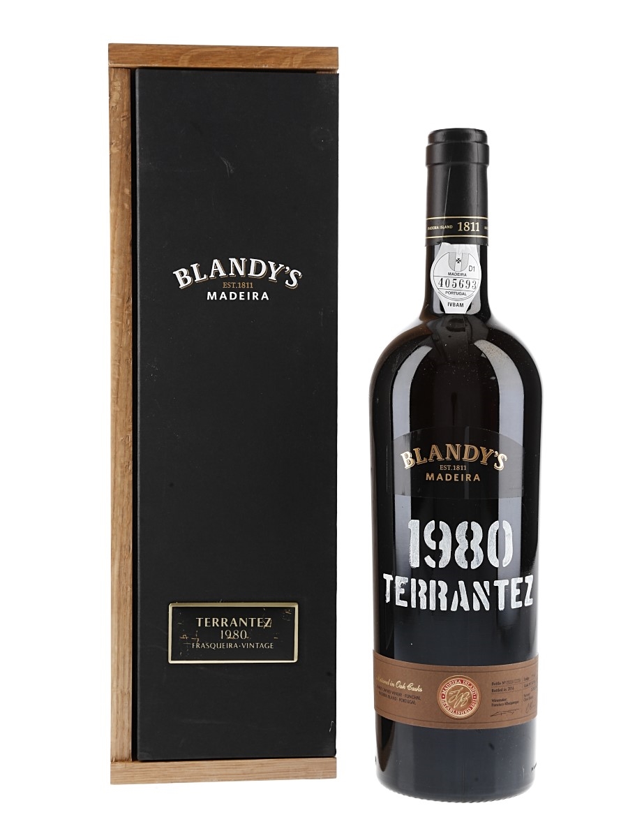 A bottle of 1980 Blandy's Terrantez Madeira, an off dry style of Madeira, bottled in 2016 from casks 24196, 24197, 24198 and 26454.