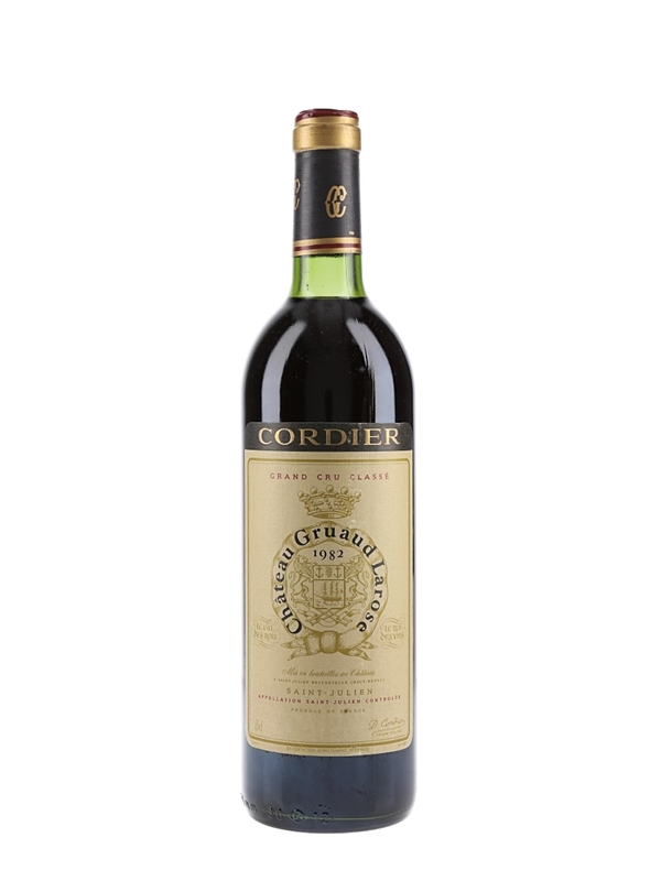 A bottle of 1982 Château Gruaud-Larose from Bordeaux's Saint-Julien appellation. The property was ranked as a Grand Cru Classé in the 1855 Classification, and its 82 hectares are planted with 57% Cabernet Sauvignon, 31% Merlot, 7.5% Cabernet Franc, 3% Petit Verdot and 1.5% Malbec.